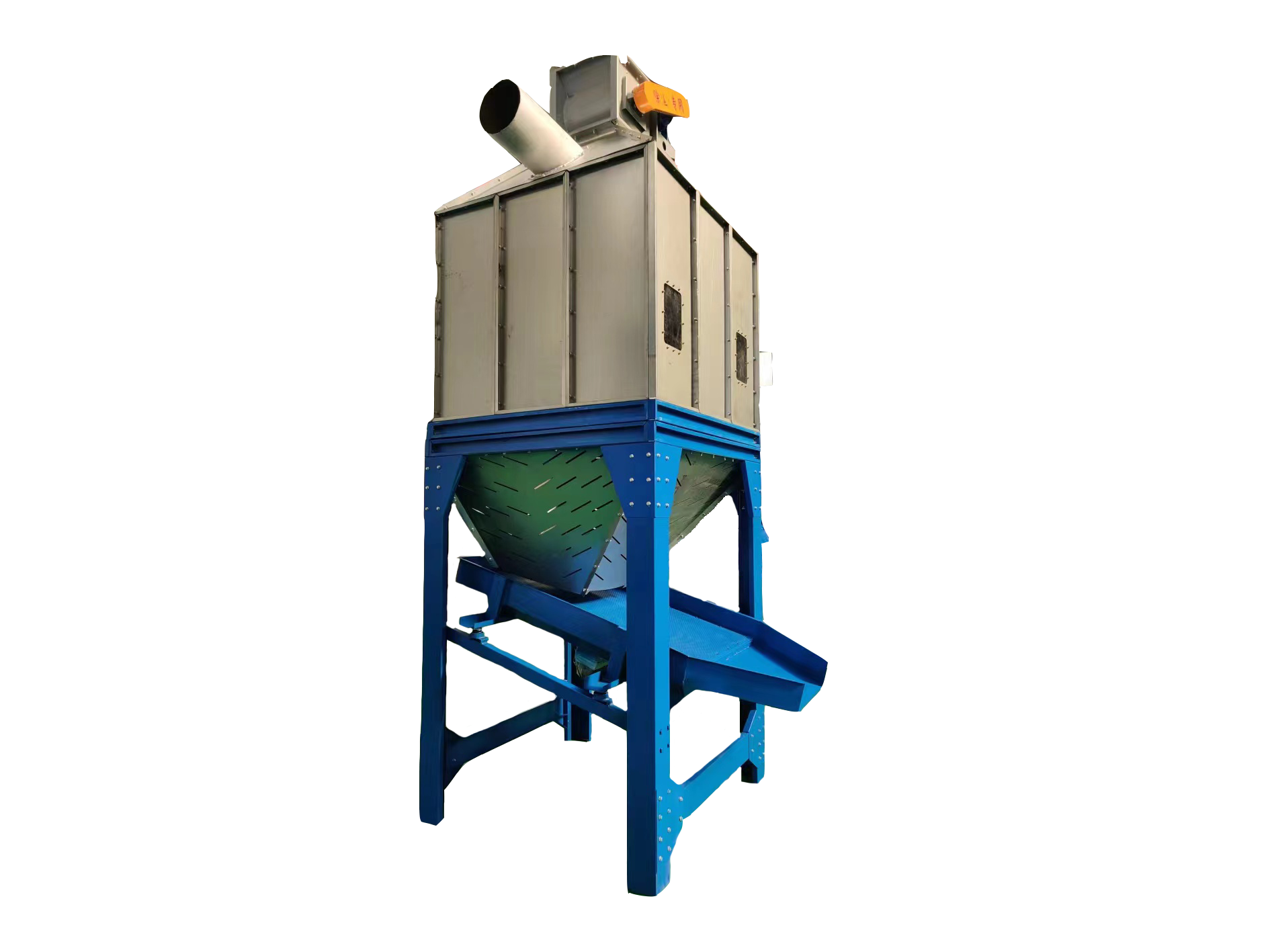逆流式冷却器是目前国际上比较先进的一种新型冷却器,它是利用逆流冷却原理对高温、高湿度的颗粒料进行冷却。自然风垂直穿过料层,先与料层相接触,逐步变热的热风与热料相接触,风流方向与料流方向相反,使颗粒料顺向逐步冷却,可避免因冷风与高温颗粒料直接接触,使颗粒骤冷而引起的颗粒表面开裂,空气从其底部全方位进入冷却器,进风面积大,利用率高,能耗低,操作简便,冷却效果显著。颗粒冷却充分、均匀,采用独特的滑阀震动是机械排料、运转平稳,排料流畅,冷却后的颗粒温度为室温这±10-15C.